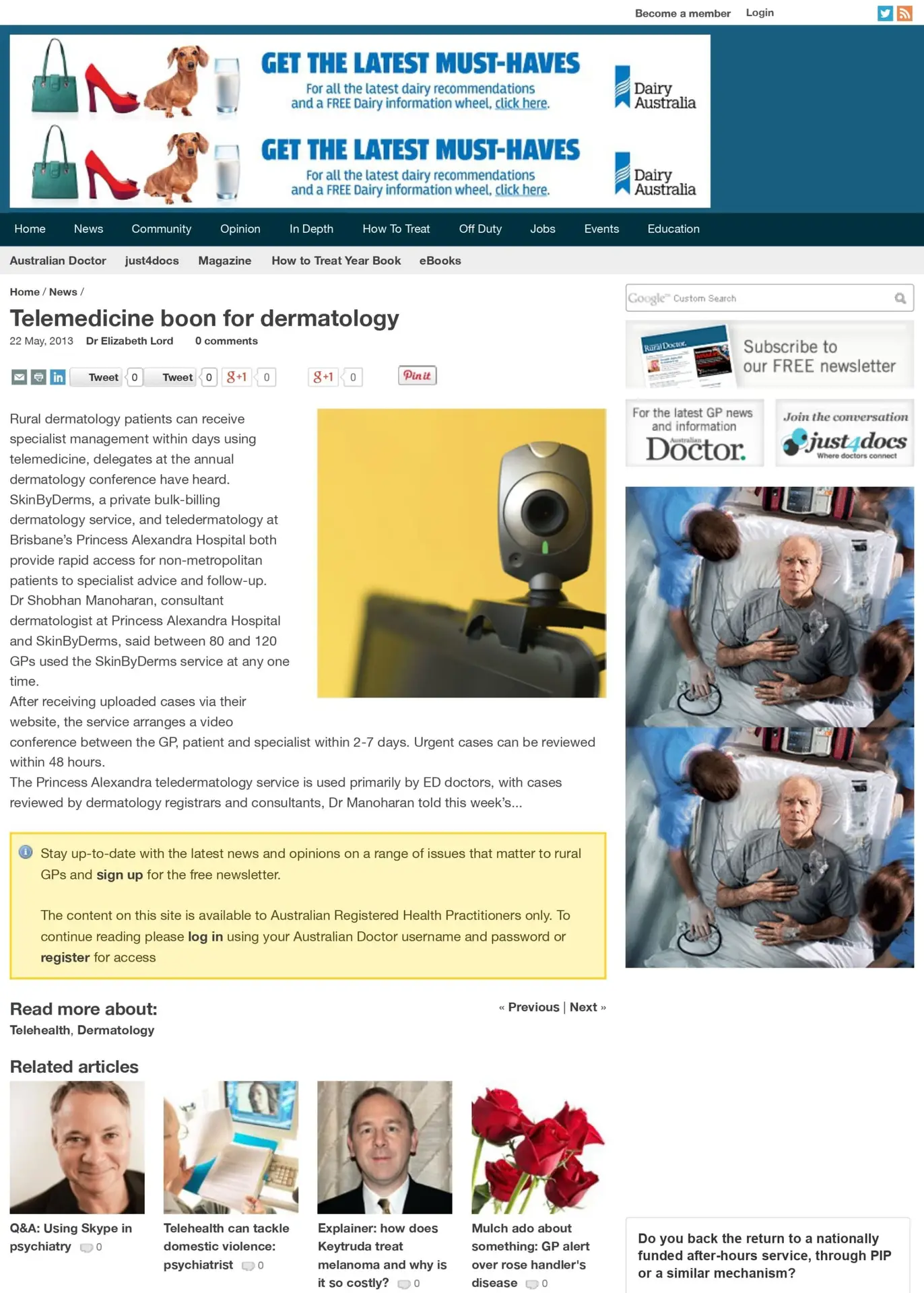 SkinByDerms, a private bulk-billing dermatology service, and teledermatology at Brisbane’s Princess Alexandra Hospital both provide rapid access for non-metropolitan patients to specialist advice and follow-up.