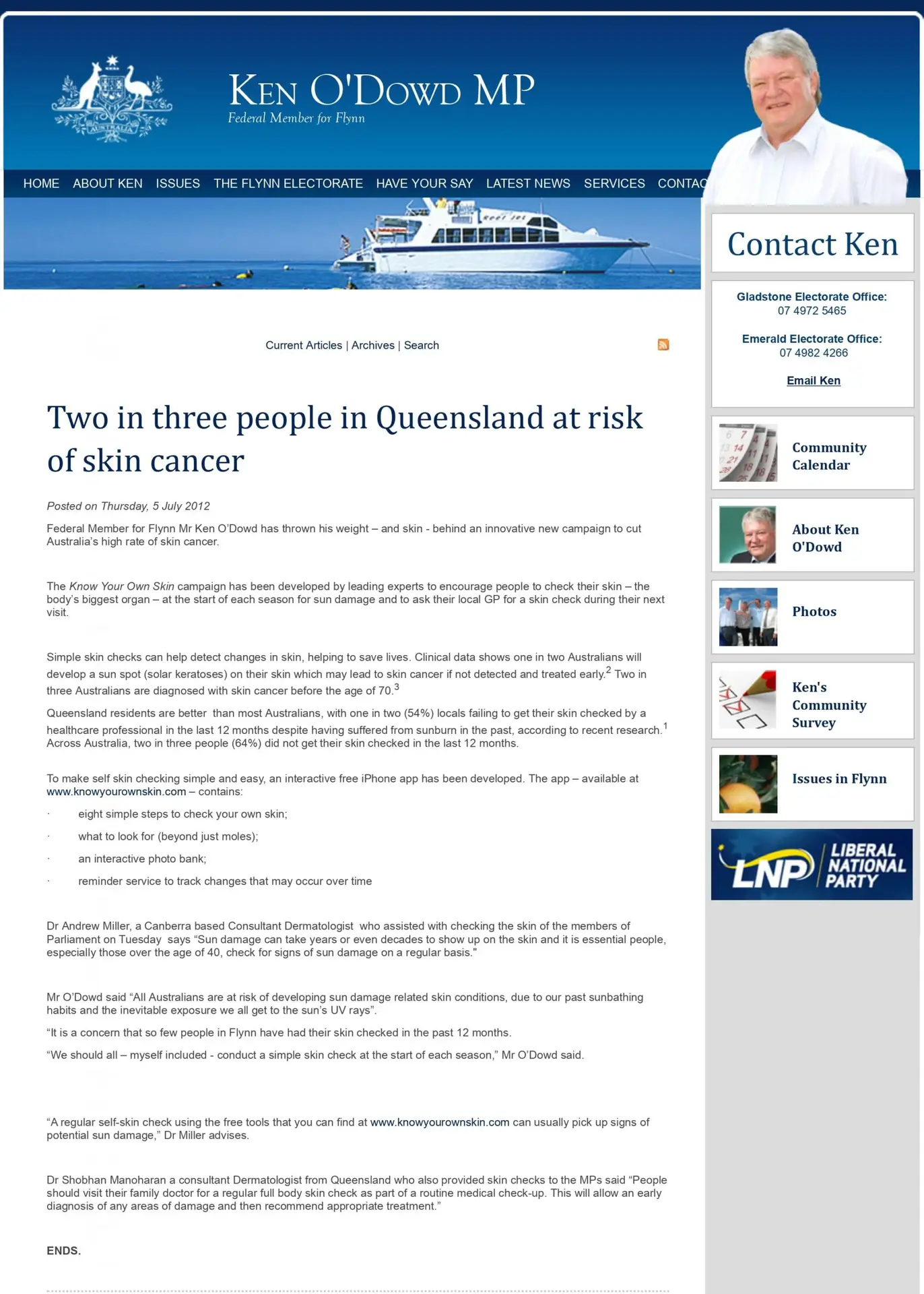 Federal Member for Flynn Mr Ken O’Dowd has thrown his weight – and skin – behind an innovative new campaign to cut Australia’s high rate of skin cancer.